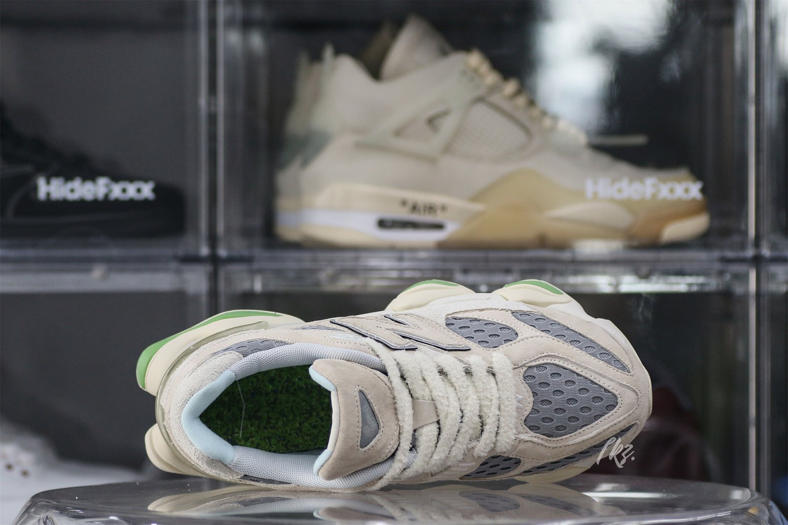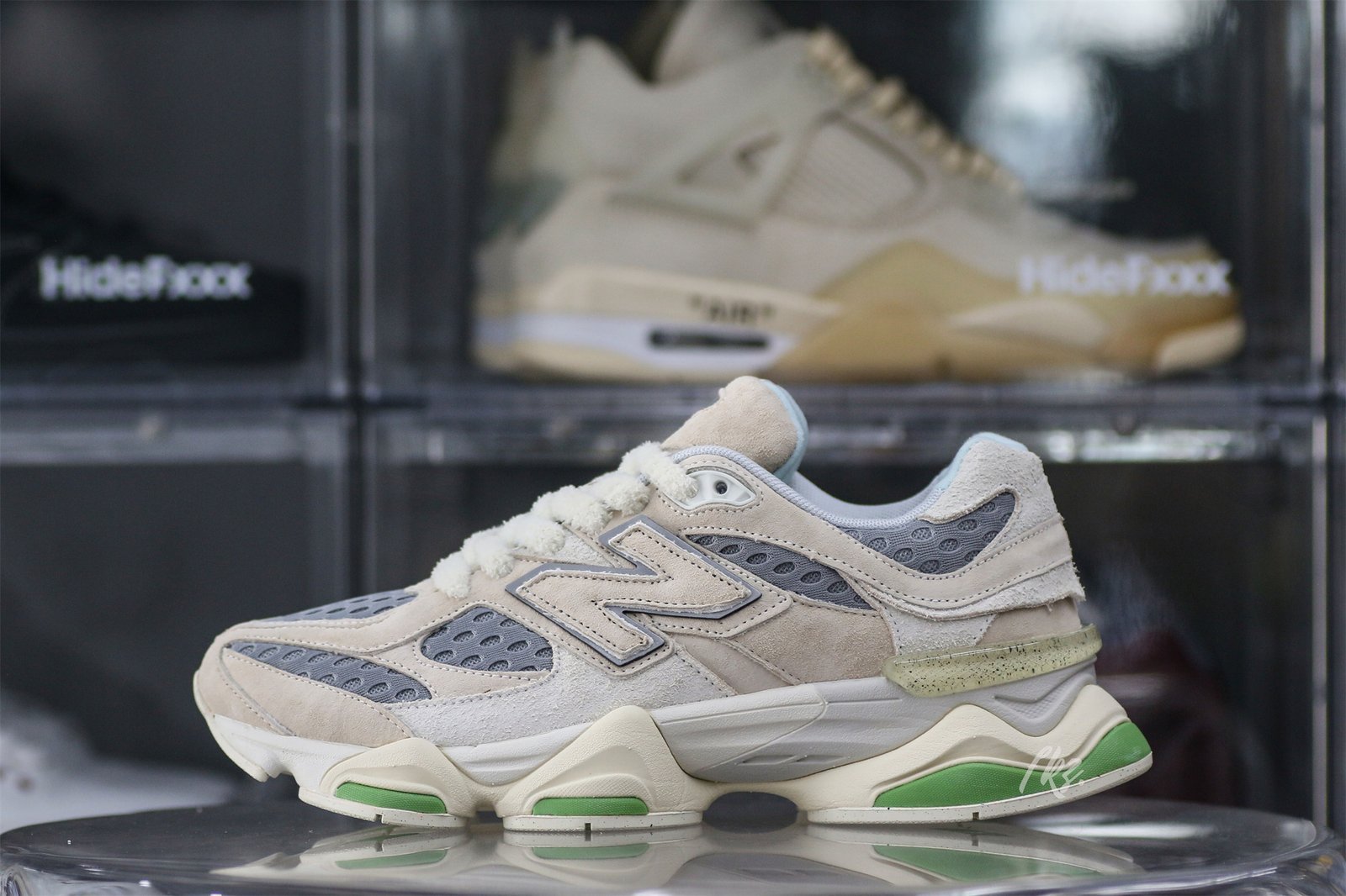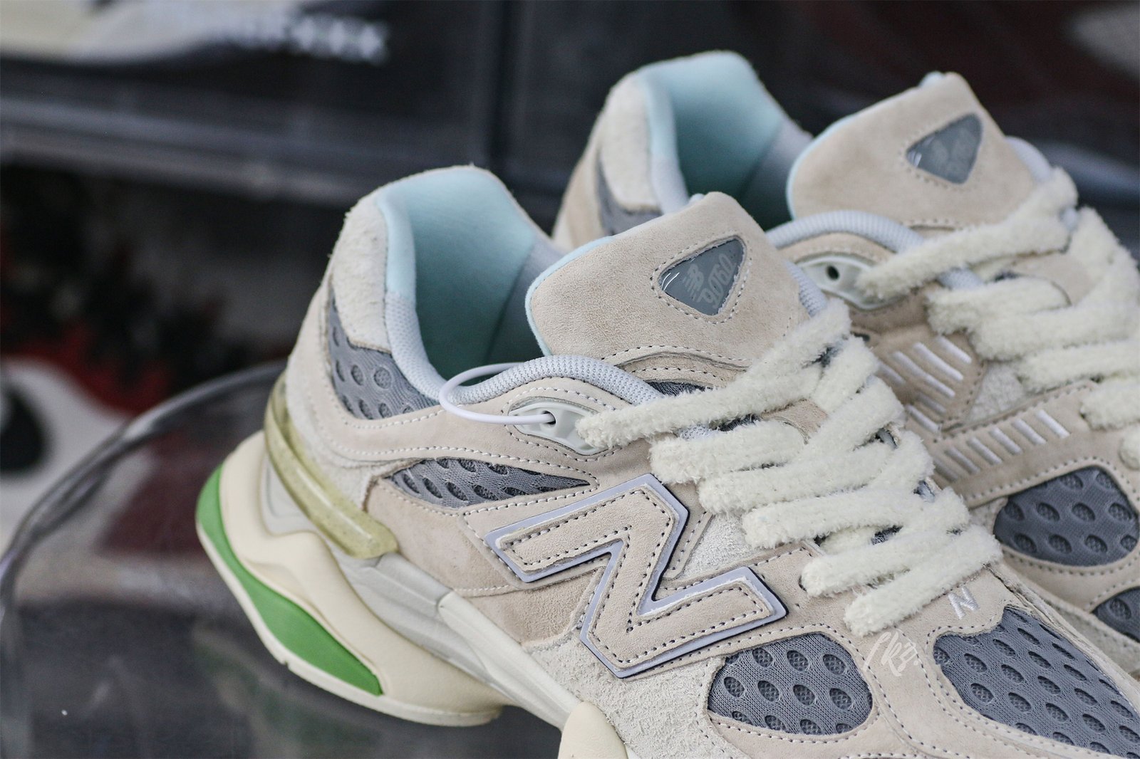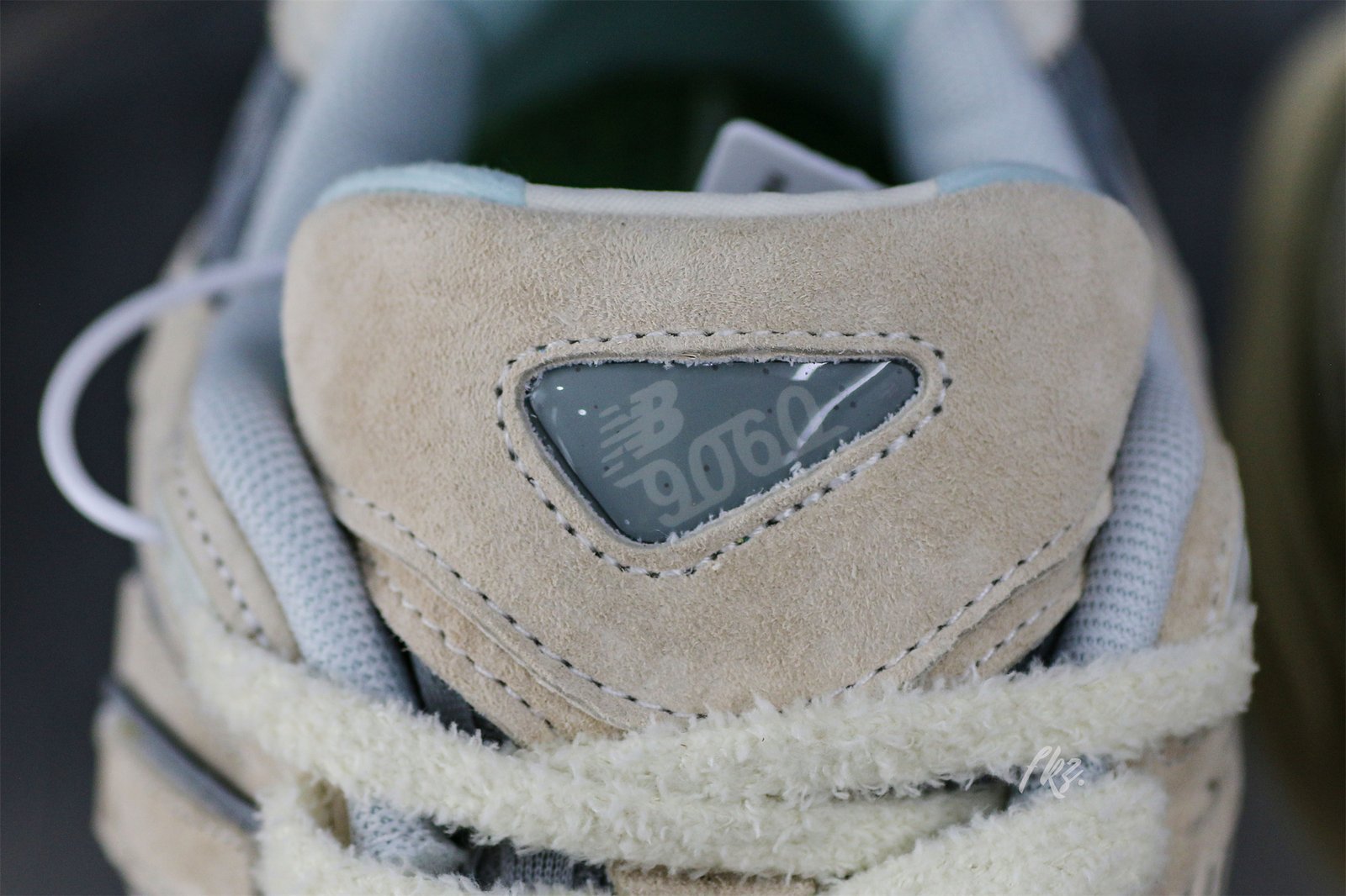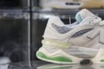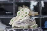 The Bricks & Wood x New Balance 9060 ‘Nothing Changed but the Address’ honors the former brand’s origin in South Central Los Angeles with a muted color scheme. The shoe’s upper is secured with fuzzy laces and consists of airy grey mesh with overlays made of smooth and hairy suede in a cream hue. The tongue displays a jeweled NB 9060 logo. while the custom sockliner has Bricks & Wood branding. to The dual-density midsole has lime green accents and incorporates New Balance’s ABZORB and SBS cushioning technology.