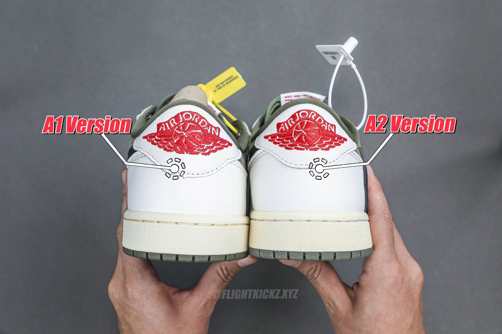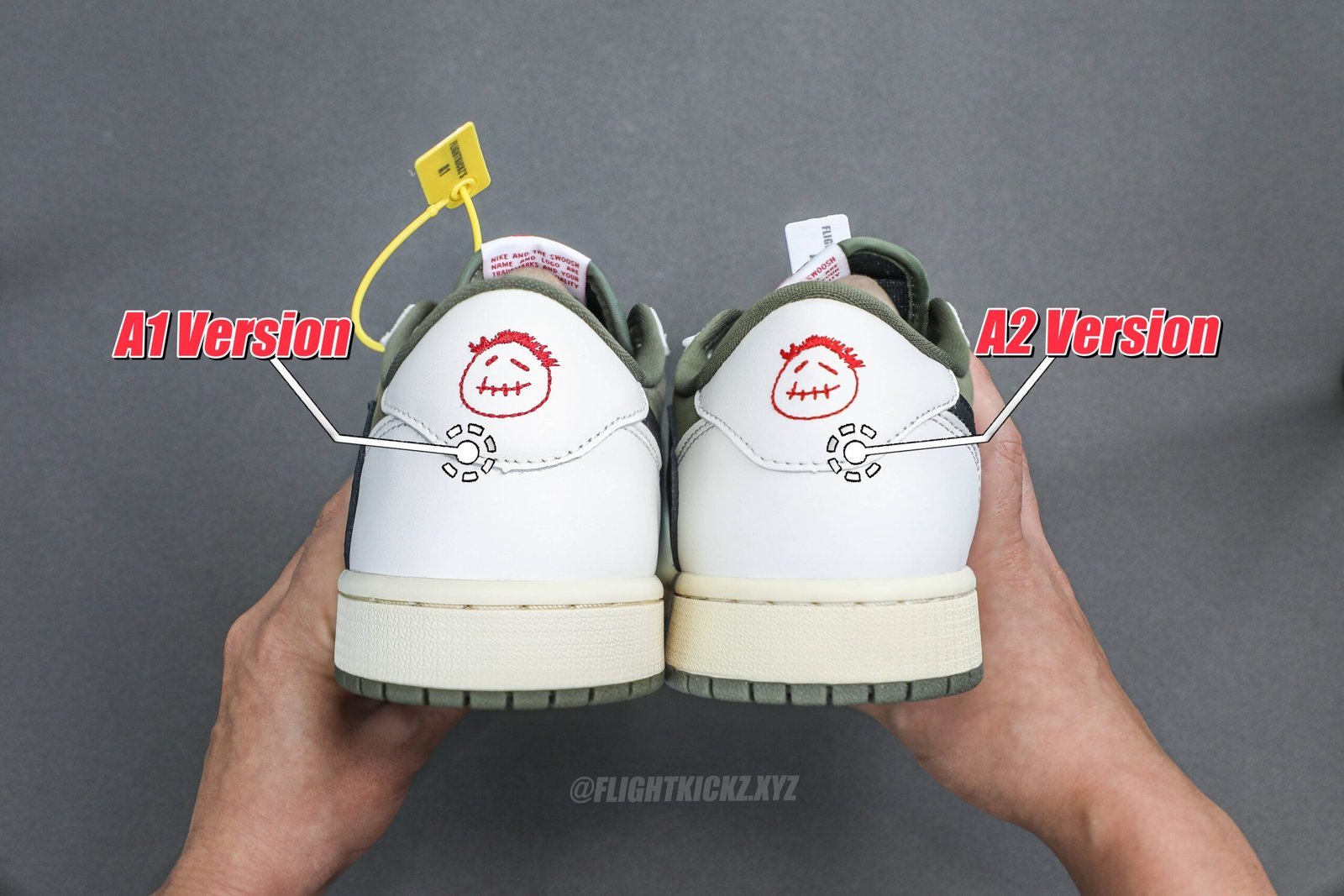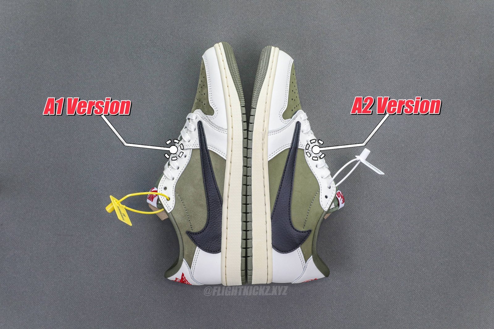 We have also provided a series of comparison images to give you a clear view of the quality differences between the Flightkickz A1 and A2 versions. Additionally. our A1 version comes with a yellow security tag. while the A2 version features a white security tag.